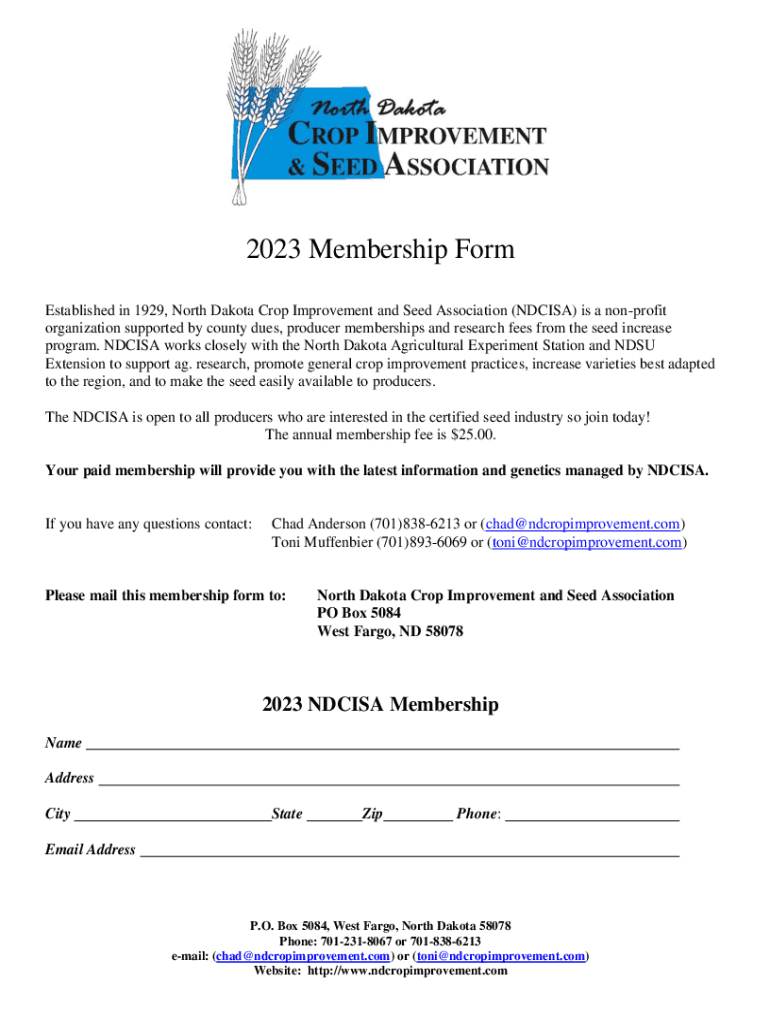 2023 Membership Form Established in 1929, North Dakota Crop Improvement and Seed Association (NDCISA) is a nonprofit organization supported by county dues, producer memberships and research fees from
