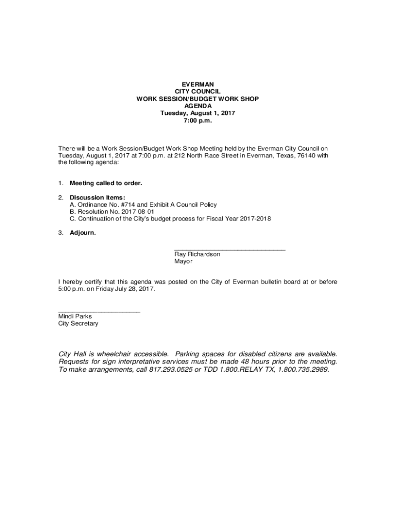 EVERMAN CITY COUNCIL WORK SESSION/BUDGET WORK SHOP AGENDA Tuesday, August 1, 2017 7:00 p.m.There will be a Work Session/Budget Work Shop Meeting held by the Everman City Council on Tuesday, August