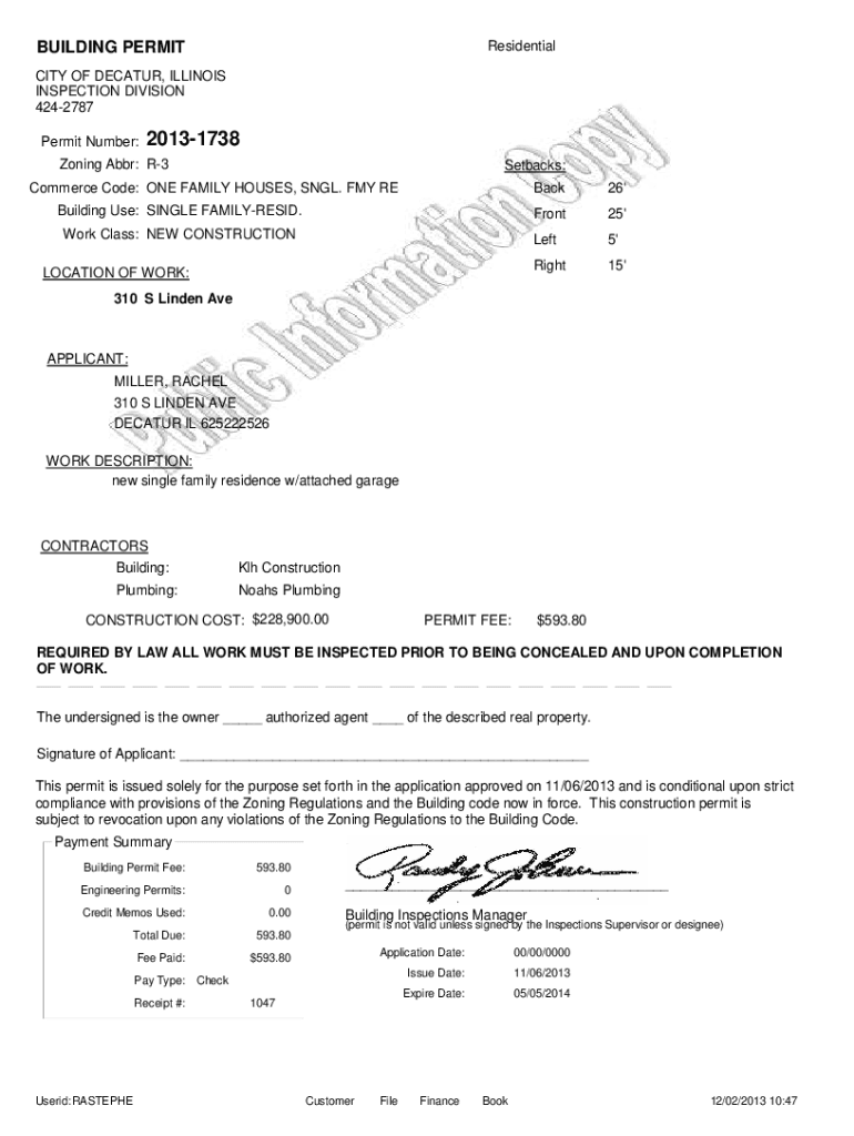 BUILDING PERMITResidentialCITY OF DECATUR, ILLINOIS INSPECTION DIVISION 4242787 Permit Number:20131738Zoning Abbr: R3Setbacks:Commerce Code: ONE FAMILY HOUSES, SNGL. FMY RES Building Use: SINGLE FAMILYRESID.