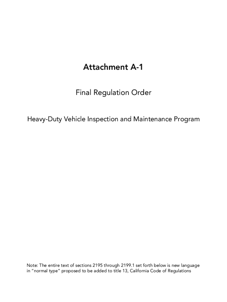 Attachment A1 Final Regulation Order HeavyDuty Vehicle Inspection and Maintenance ProgramNote: The entire text of sections 2195 through 2199.1 set forth below is new language in normal type proposed