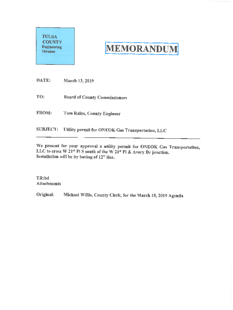 TULSA COUNTYPVIEMORANDU^Engineering DivisionDATE:March 13, 2019TO:Board of County CommissionersFROM:Tom Rains, County EngineerSUBJECT: Utility permit for ONEOK Gas Transportation, LLCWe present for