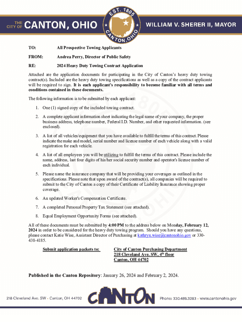 TO:All Prospective Towing ApplicantsFROM:Andrea Perry, Director of Public SafetyRE:2024 Heavy Duty Towing Contract ApplicationAttached are the application documents for participating in the City of