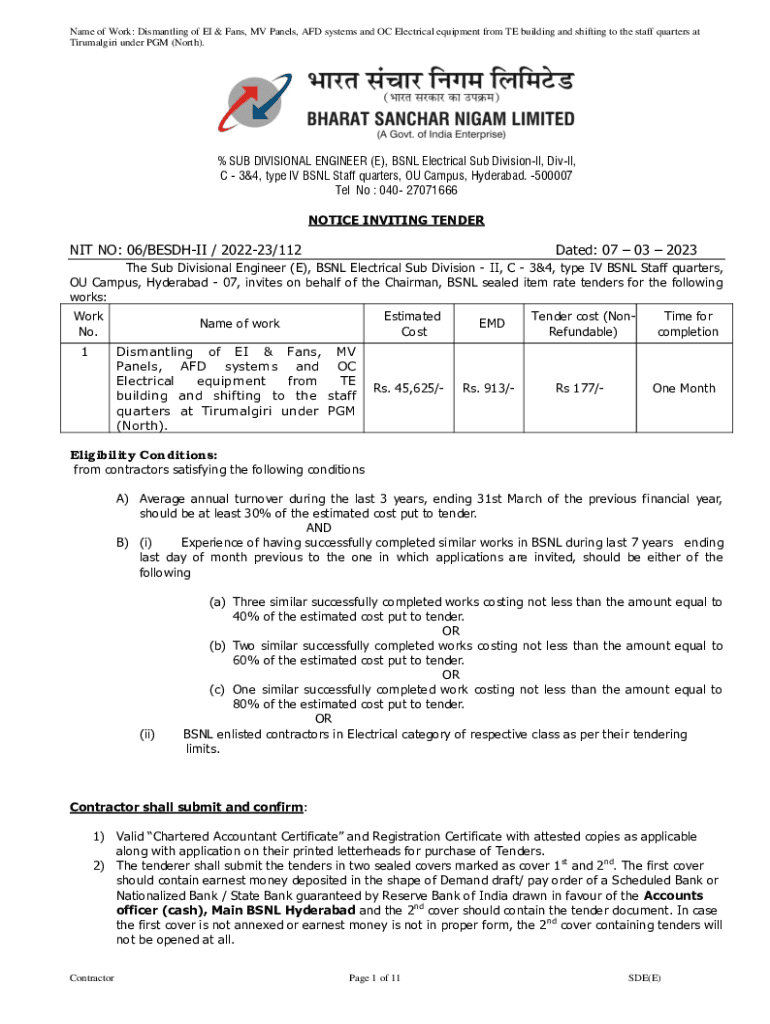 Name of Work: Dismantling of EI & Fans, MV Panels, AFD systems and OC Electrical equipment from TE building and shifting to the staff quarters at Tirumalgiri under PGM (North).% SUB DIVISIONAL ENGINEER