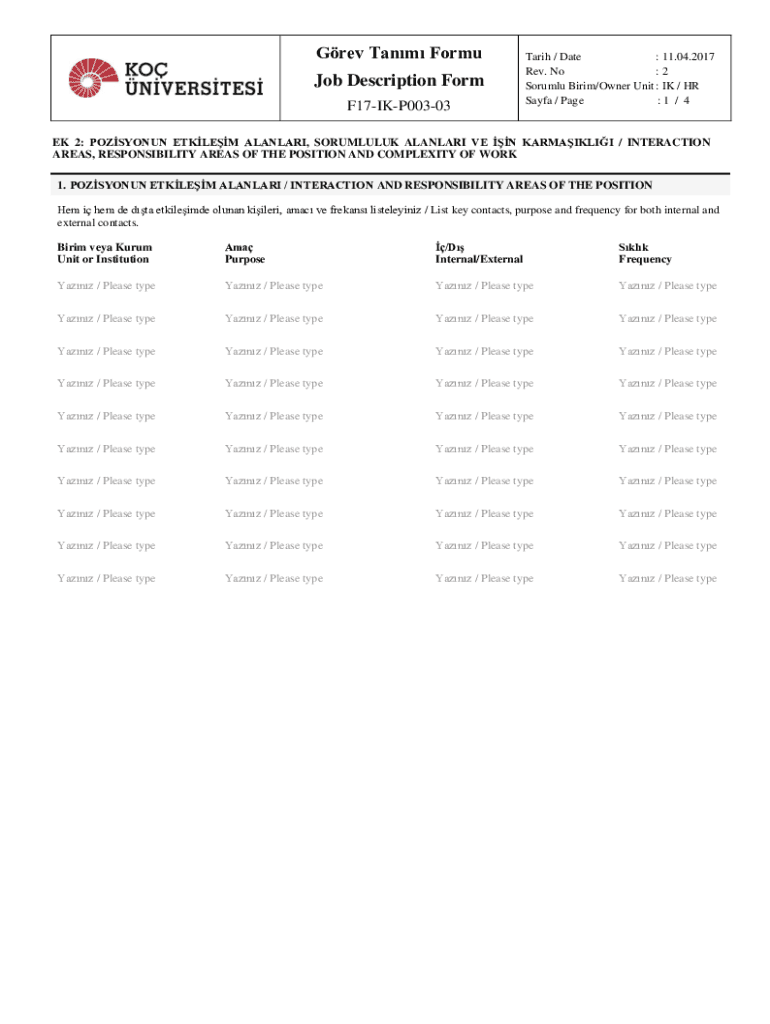 Grev Tanm Formu Job Description Form F17IKP00303Tarih / Date : 11.04.2017 Rev. No :2 Sorumlu Birim/Owner Unit : IK / HR Sayfa / Page :1 / 4EK 2: POZSYONUN ETKLEM ALANLARI, SORUMLULUK ALANLARI VE N
