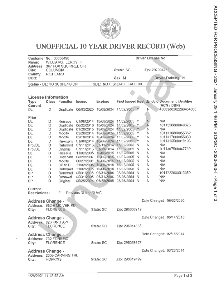 Driver License No:Customer No: 30608498 Name:Address: City:County: DOB:WILLIAMS, LEROY II 367 FOX SQUIRREL CIR COLUMBIA RICHLANDState: SC Sex:\"Status DL: NO SUSPENSIONLicense Information Type Current