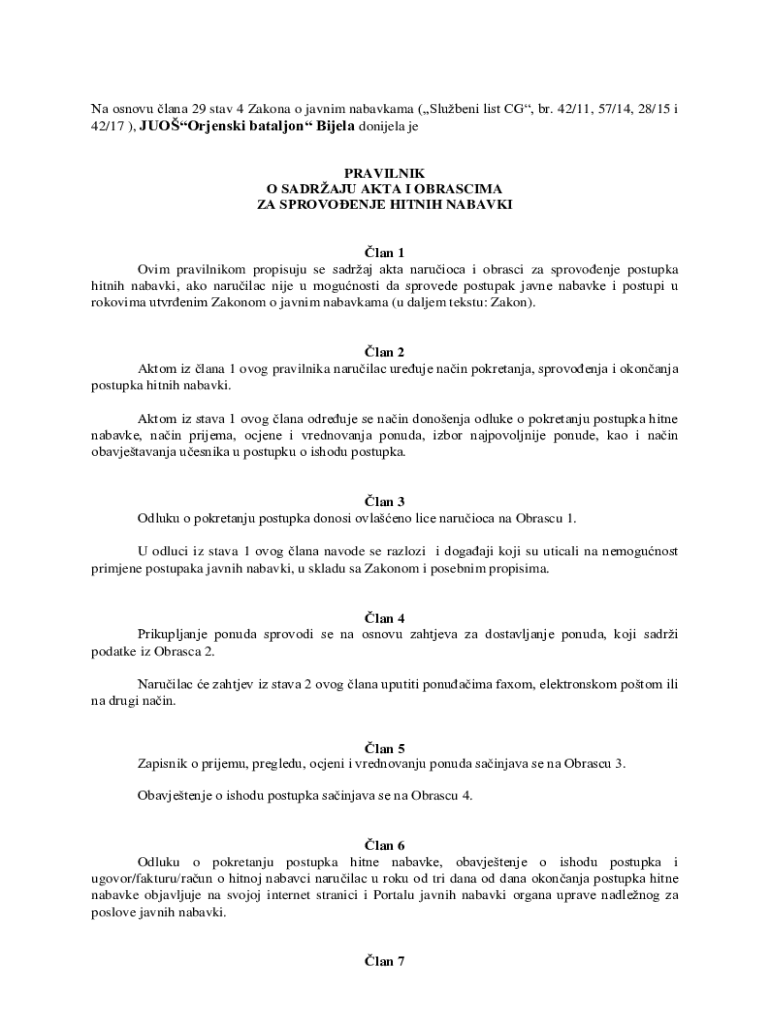 Na osnovu lana 29 stav 4 Zakona o javnim nabavkama (Slubeni list CG, br. 42/11, 57/14, 28/15 i 42/17 ), JUOOrjenski bataljon Bijela donijela jePRAVILNIK O SADRAJU AKTA I OBRASCIMA ZA SPROVOENJE HITNIH