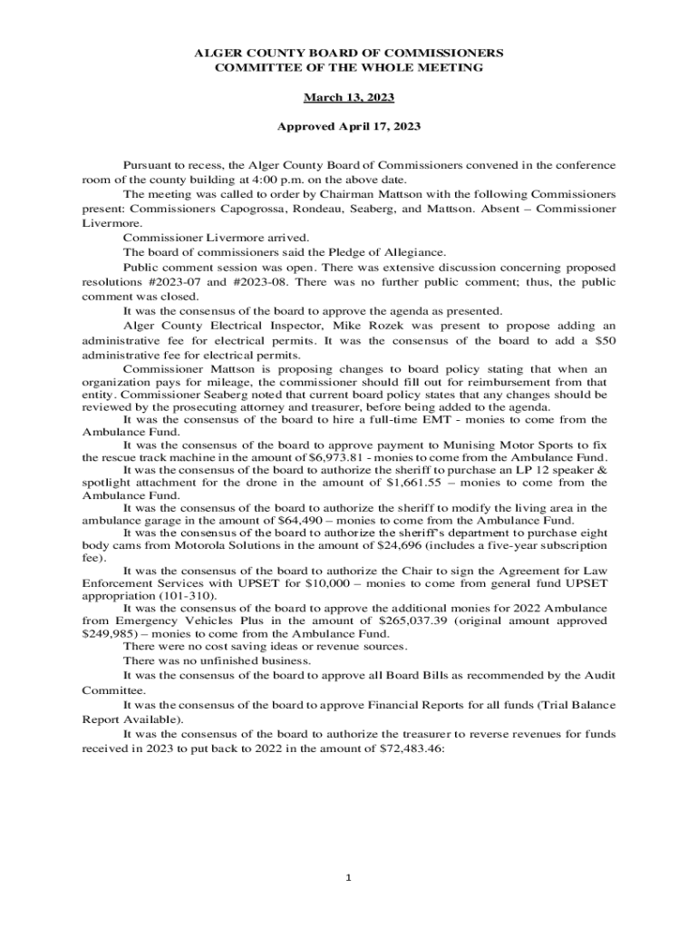 ALGER COUNTY BOARD OF COMMISSIONERS COMMITTEE OF THE WHOLE MEETING March 13, 2023 Approved April 17, 2023Pursuant to recess, the Alger County Board of Commissioners convened in the conference room