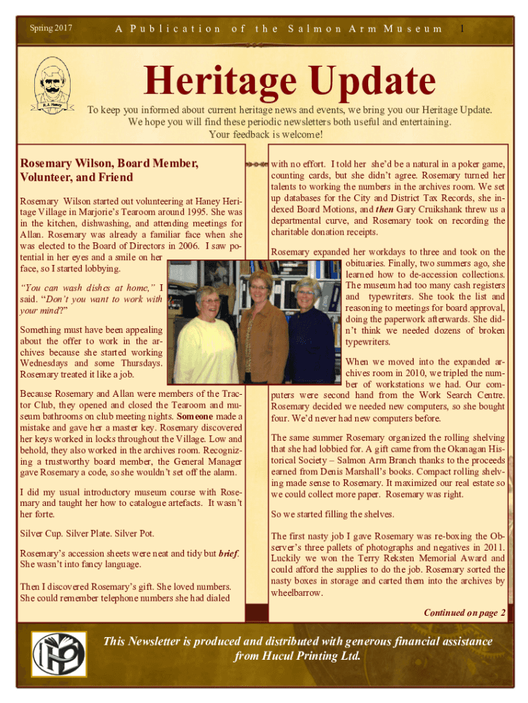 Spring 2017A P u b l i c a t i o no ft h eS a l m o n A r m M u s e u m1Heritage Update To keep you informed about current heritage news and events, we bring you our Heritage Update. We hope you will