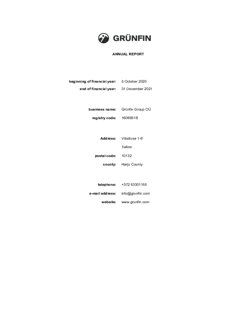 ANNUAL REPORTbeginning of financial year: end of financial year:business name: registry code:Address:5 October 2020 31 December 2021Grnfin Group O 16069318Vistluse 16 Tallinnpostal code: county:telephone:10132