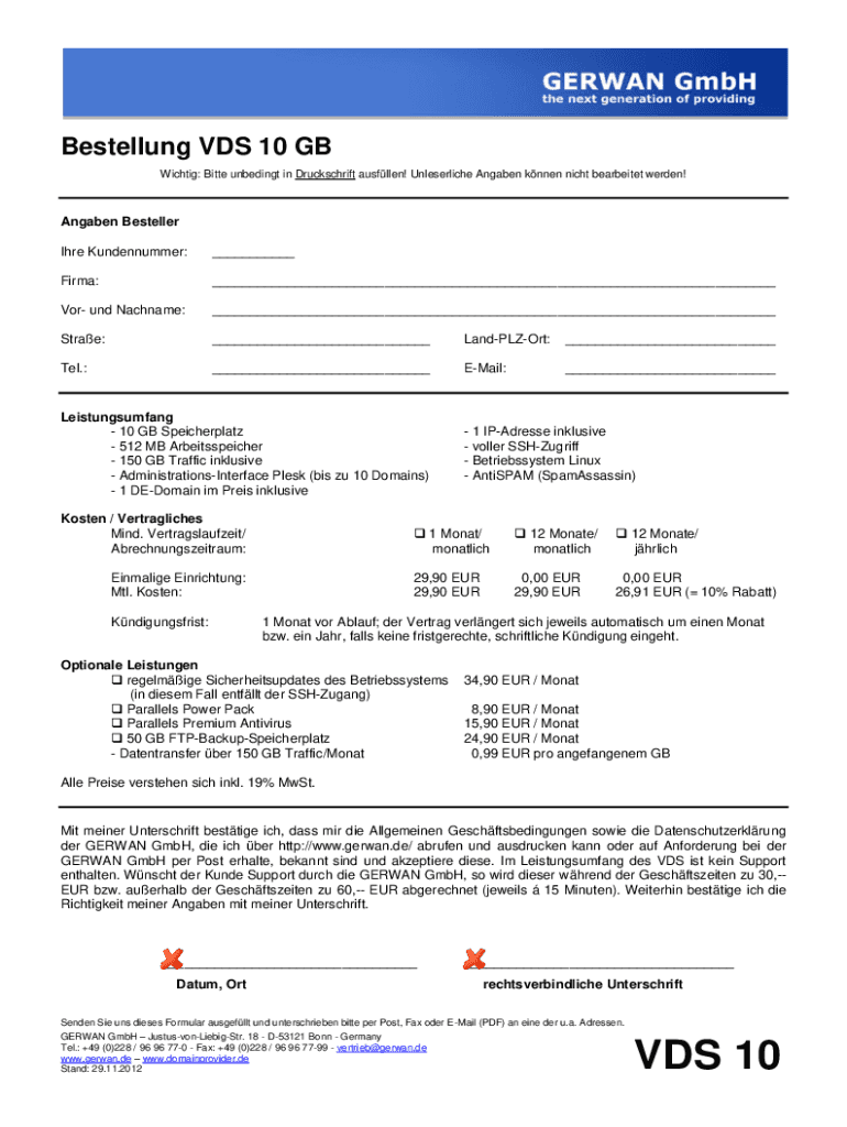 Bestellung VDS 10 GB Wichtig: Bitte unbedingt in Druckschrift ausfllen! Unleserliche Angaben knnen nicht bearbeitet werden!Angaben Besteller Ihre Kundennummer:___Firma:___Vor und Nachname:___Strae:___LandPLZOrt:___Tel.:___EMail:___Leistungsumfang