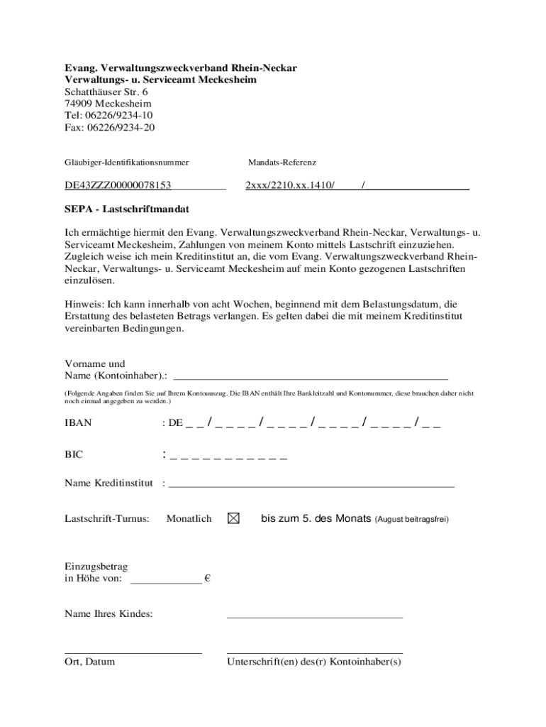 Evang. Verwaltungszweckverband RheinNeckar Verwaltungs u. Serviceamt Meckesheim Schatthuser Str. 6 74909 Meckesheim Tel: 06226/923410 Fax: 06226/923420GlubigerIdentifikationsnummerMandatsReferenzDE43ZZZ00000078153___2xxx/2210.xx.1410//___SEPA
