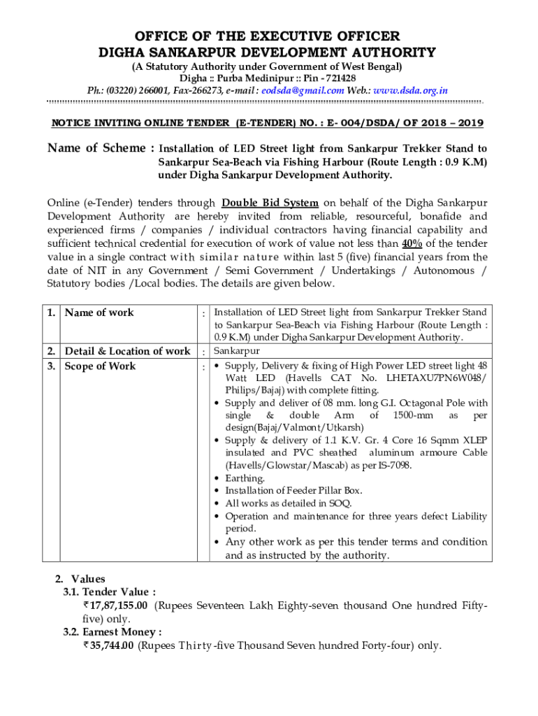 OFFICE OF THE EXECUTIVE OFFICER DIGHA SANKARPUR DEVELOPMENT AUTHORITY(A Statutory Authority under Government of West Bengal) Digha :: Purba Medinipur :: Pin 721428 Ph.: (03220) 266001, Fax266273,