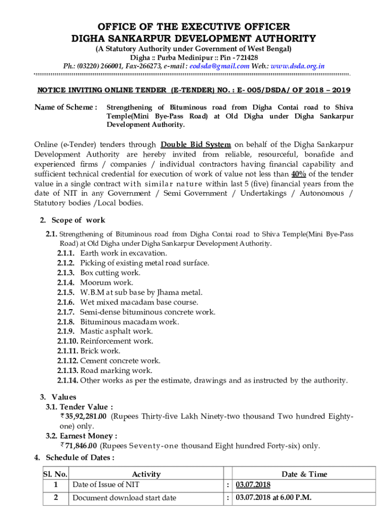 OFFICE OF THE EXECUTIVE OFFICER DIGHA SANKARPUR DEVELOPMENT AUTHORITY(A Statutory Authority under Government of West Bengal) Digha :: Purba Medinipur :: Pin 721428 Ph.: (03220) 266001, Fax266273,