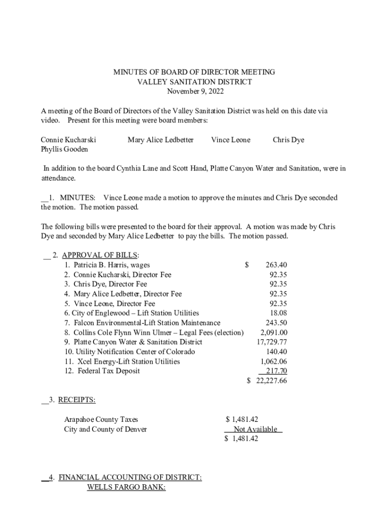 MINUTES OF BOARD OF DIRECTOR MEETING VALLEY SANITATION DISTRICT November 9, 2022 A meeting of the Board of Directors of the Valley Sanitation District was held on this date via video. Present for