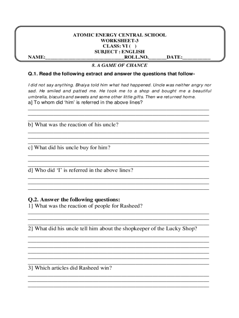 ATOMIC ENERGY CENTRAL SCHOOL WORKSHEET3 CLASS: VI ( ) SUBJECT : ENGLISH NAME:___ROLL.NO.___DATE:___ 8. A GAME OF CHANCE Q.1. Read the following extract and answer the questions that followI did not