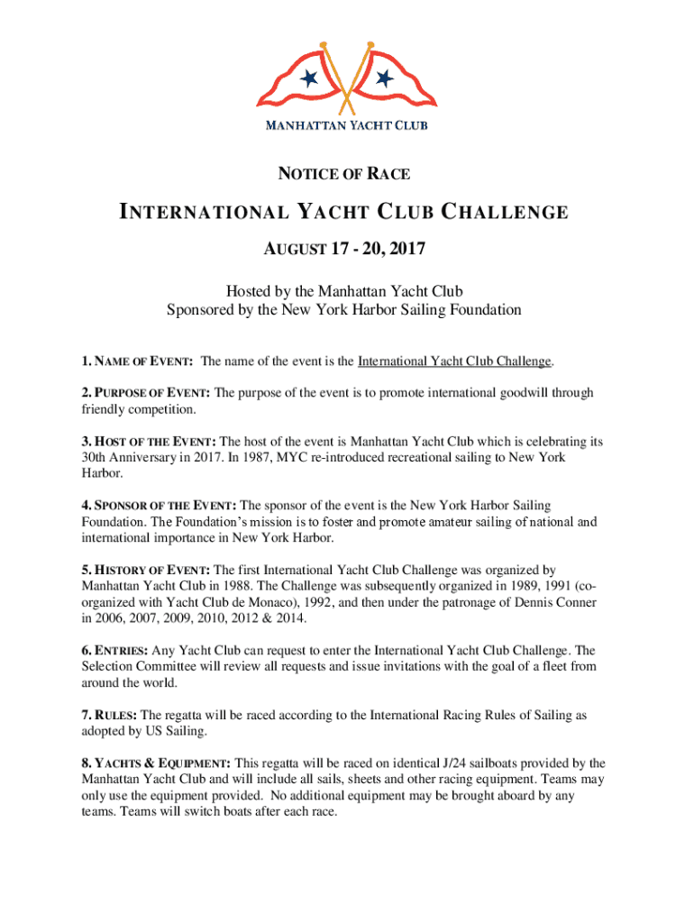 NOTICE OF RACEI NTERNATIONAL Y ACHT C LUB C HALLENGE AUGUST 17 20, 2017 Hosted by the Manhattan Yacht Club Sponsored by the New York Harbor Sailing Foundation 1. NAME OF EVENT: The name of the event