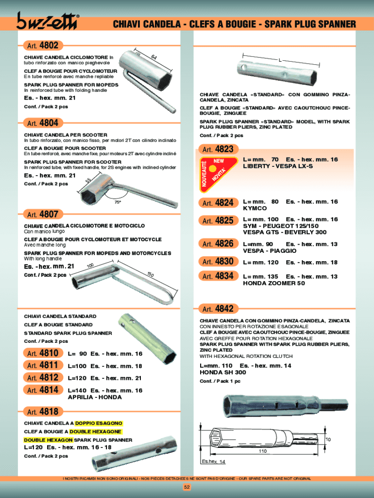 CHIAVI CANDELA CLEFS A BOUGIE SPARK PLUG SPANNER Art.4802 64CHIAVE CANDELA CICLOMOTORE In tuborinforzatoconmanicopieghevoleLCLEf A BOUGIE POUR CYCLOMOTEUR Entuberenforcavecmancherepliable SPARK PLUG