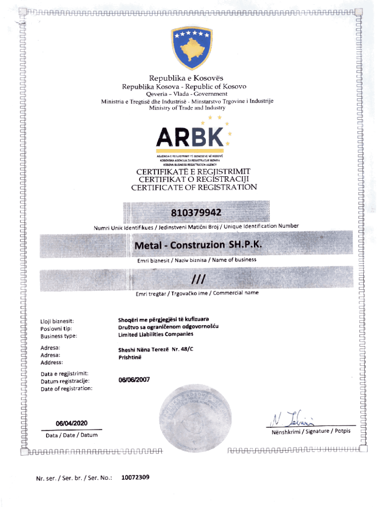 **Republika e Kosovs Republika Kosova Republic of Kosovo Qeveria Vlada GovernmentMinistria e Tregtis dhe Industris Minstarstvo Trgovine i IndustrijeMinistry of Trade and IndustryARBK AGJENCIA E REGJISTRIMIT