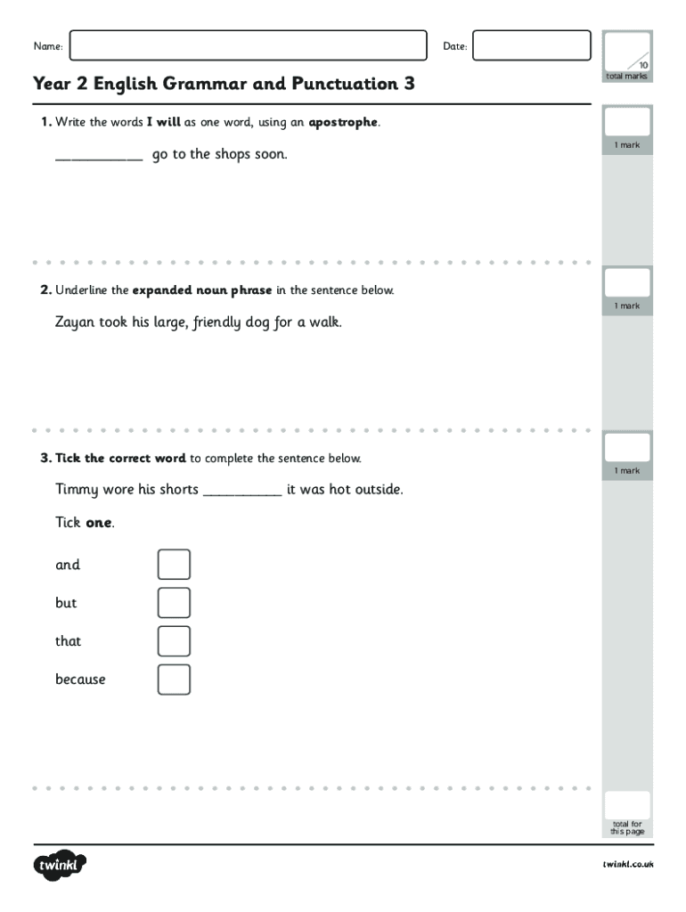 Name:Date: 10Year 2 English Grammar and Punctuation 3total marks1. Write the words I will as one word, using an apostrophe.___ go to the shops soon.1 mark2. Underline the expanded noun phrase in the