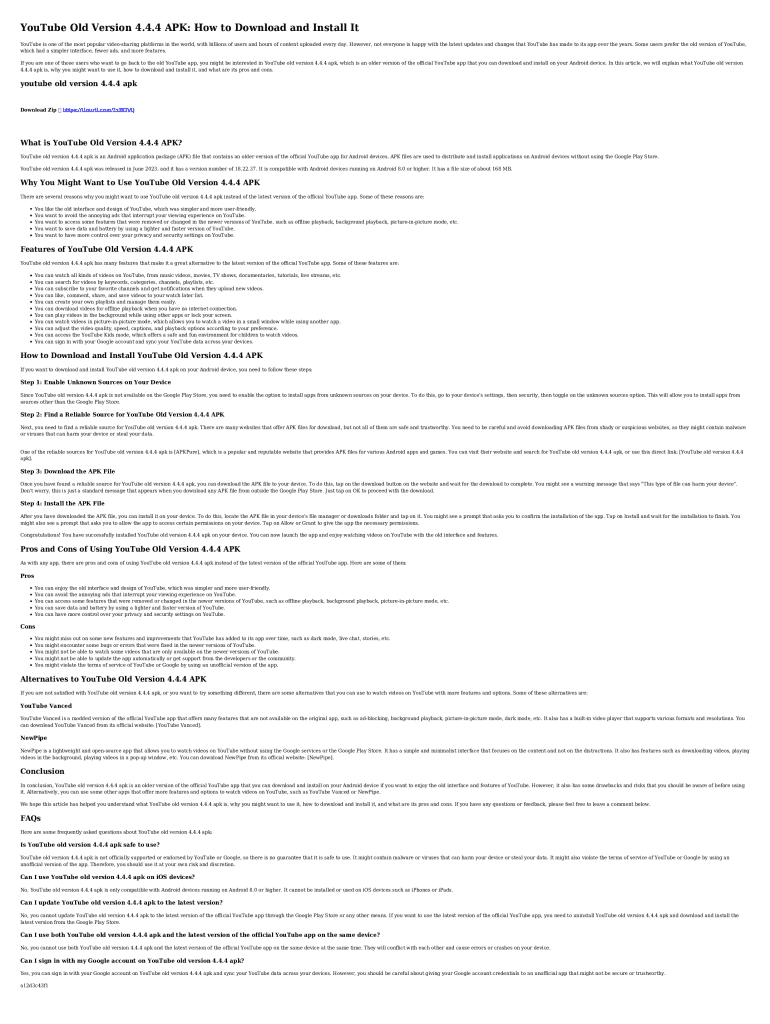 YouTube Old Version 4.4.4 APK: How to Download and Install It YouTube is one of the most popular videosharing platforms in the world, with billions of users and hours of content uploaded every day.