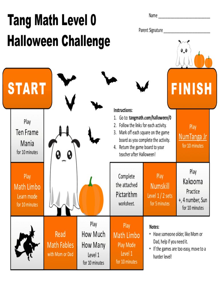 Tang Math Level 0 Halloween ChallengeName ___ Parent Signature ___S TA RTFINISH Instructions: 1. Go to: tangmath.com/halloween/0 2. Follow the links for each activity. 3. Mark off each square on the