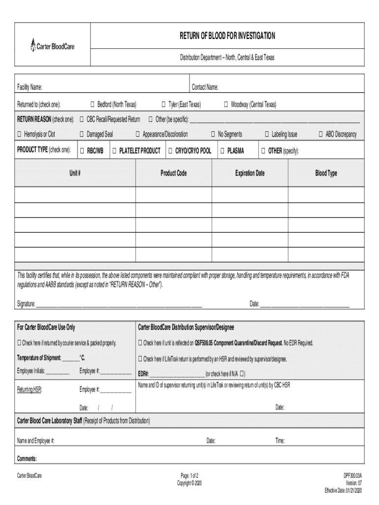 RETURN REASON (check one):Hemolysis or Bioproduct TYPE (check