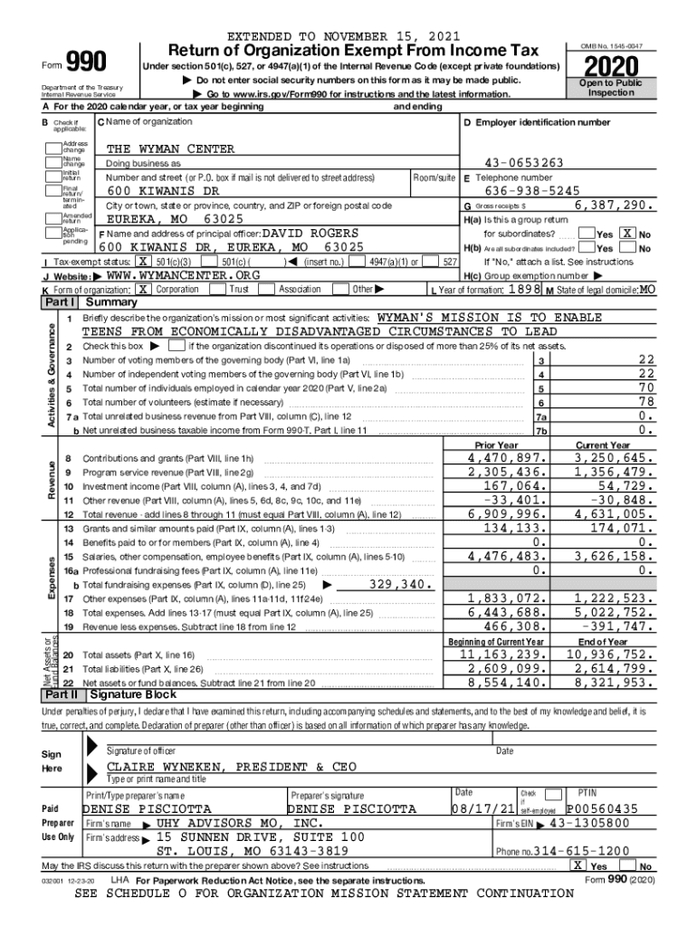 EXTENDED TO NOVEMBER 15, 2021 Form990Return of Organization Exempt From Income TaxOMB No. 15450047| Do not enter social security numbers on this form as it may be made public.Open to Public Inspection2020Under