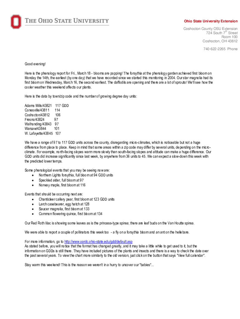 Ohio State University Extension Coshocton County OSU Extension th 724 South 7 Street Room 100 Coshocton, OH 43812 7406222265 PhoneGood evening! Here is the phenology report for Fri., March 18 blooms
