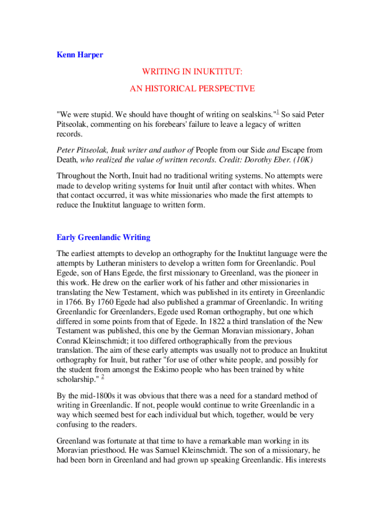 Kenn HarperWRITING IN INUKTITUT: AN HISTORICAL PERSPECTIVE \"We were stupid. We should have thought of writing on sealskins.\"1 So said Peter Pitseolak, commenting on his forebears\' failure to leave