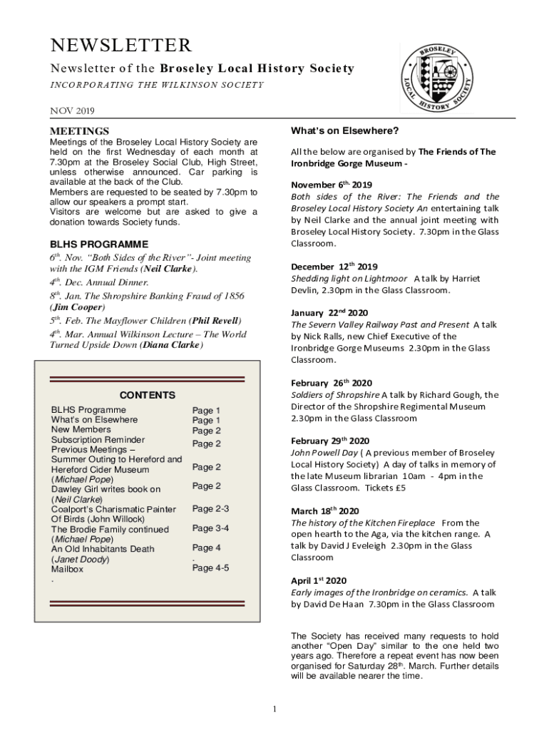 NEWSLETTER Newsletter of the Broseley Local History Society I N CO RPO RATI NG TH E WI LK I NS O N S O CIE TYNOV 2019 Whats on Elsewhere?MEETINGS Meetings of the Broseley Local History Society are