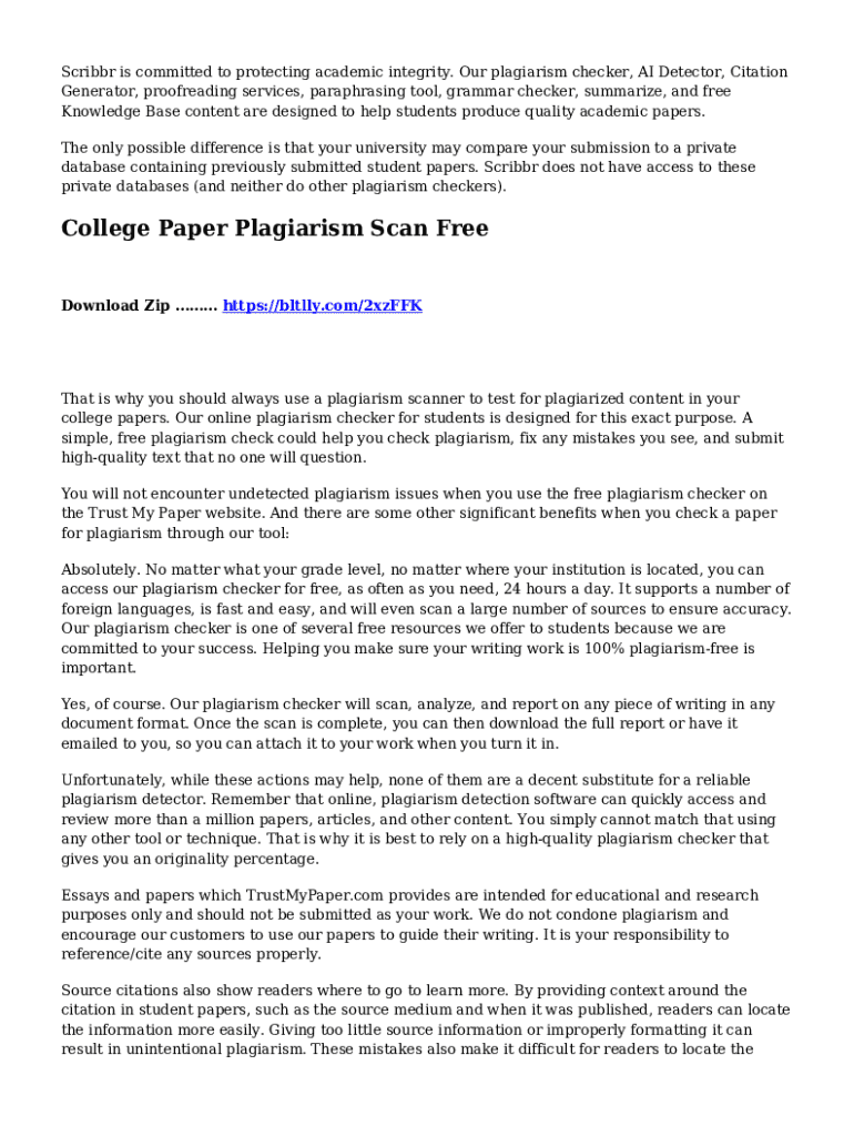 To fill out a college paper plagiarism scan, you should submit your document through the designated plagiarism detection software, complete any required forms that may accompany the submission, and follow the institution's specific guidelines regarding file formats and submission processes.