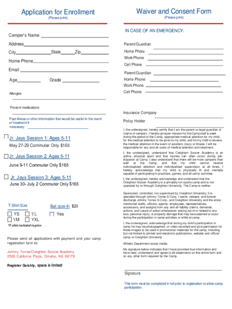 Application for EnrollmentWaiver and Consent Form(Please print)(Please print)IN CASE OF AN EMERGENCY:Campers Name