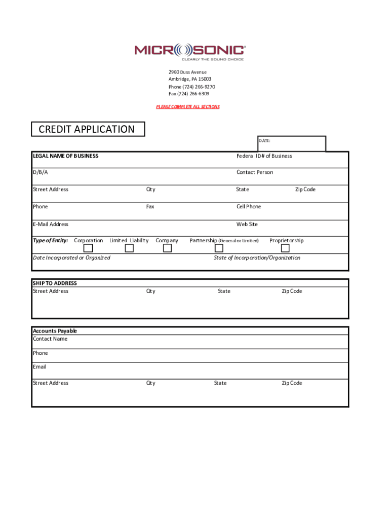 2960 Duss Avenue Ambridge, PA 15003 Phone (724) 2669270 Fax (724) 2666309 PLEASE COMPLETE ALL SECTIONSCREDIT APPLICATION DATE:LEGAL NAME OF BUSINESSFederal ID# of BusinessD/B/AContact PersonStreet