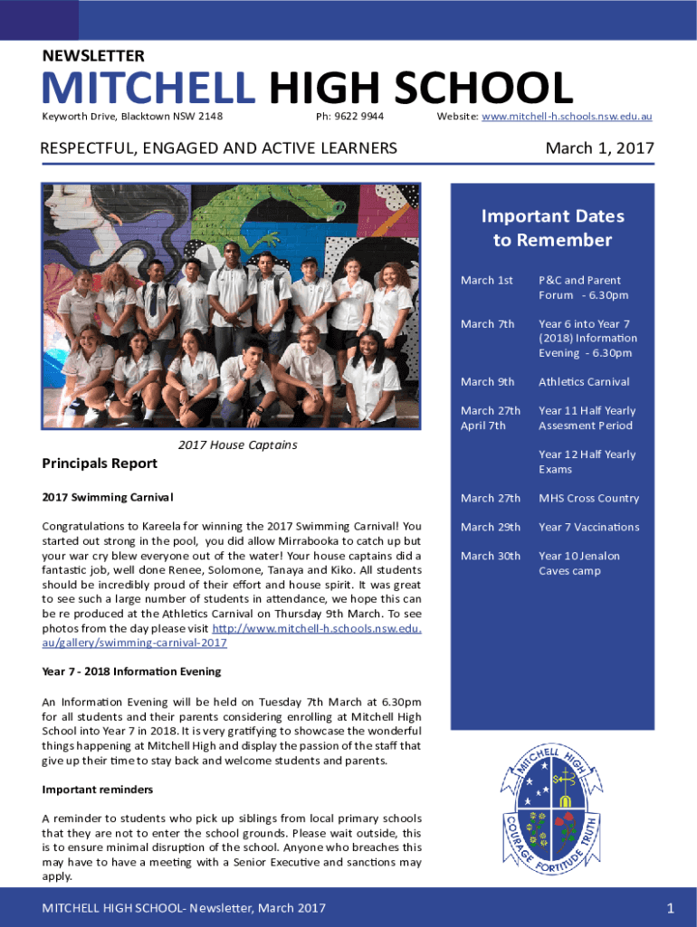 NEWSLETTERMITCHELL HIGH SCHOOL Keyworth Drive, Blacktown NSW 2148Ph: 9622 9944Website: www.mitchellh.schools.nsw.edu.auRESPECTFUL, ENGAGED AND ACTIVE LEARNERSMarch 1, 2017 Important Dates Important