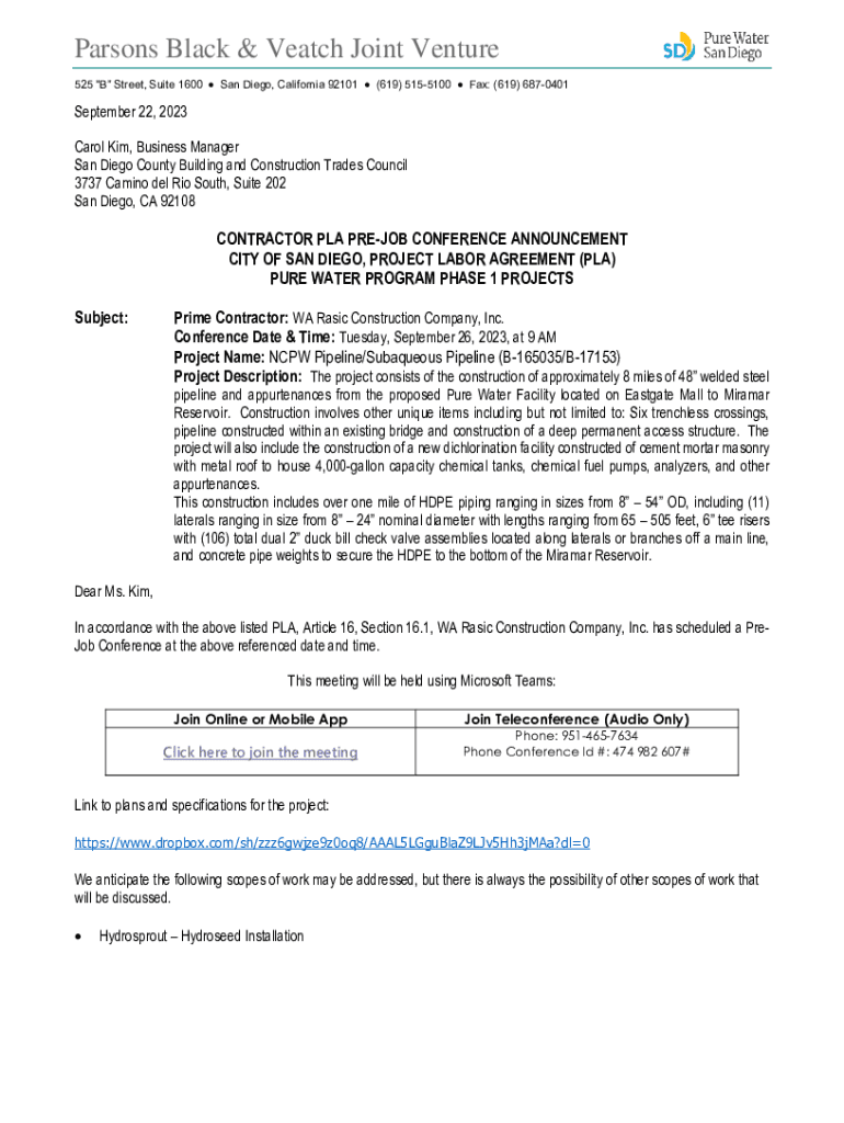 Parsons Black & Veatch Joint Venture 525 B Street, Suite 1600 San Diego, California 92101 (619) 5155100 Fax: (619) 6870401September 22, 2023 Carol Kim, Business Manager San Diego County Building and