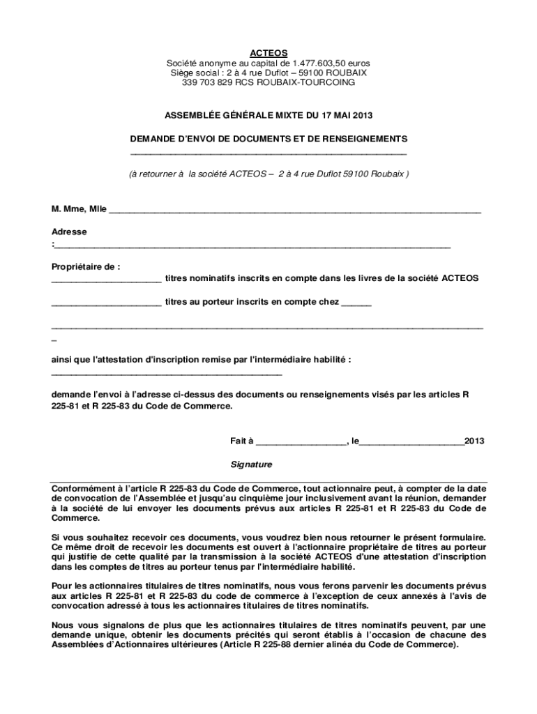 ACTEOS Socit anonyme au capital de 1.477.603,50 euros Sige social : 2 4 rue Duflot 59100 ROUBAIX 339 703 829 RCS ROUBAIXTOURCOINGASSEMBLE GNRALE MIXTE DU 17 MAI 2013 DEMANDE DENVOI DE DOCUMENTS ET