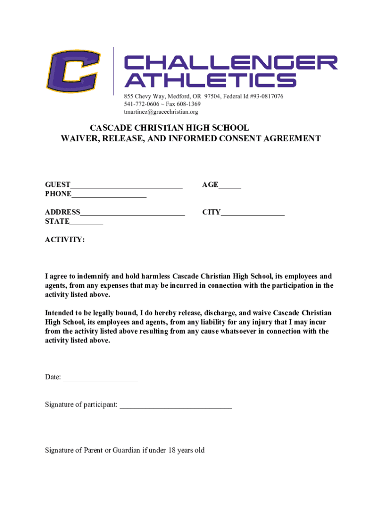 CASCADE CHRISTIAN HIGH SCHOOL WAIVER, RELEASE, AND INFORMED CONSENT AGREEMENTGUEST___ PHONE___AGE___ADDRESS___ STATE___CITY___ACTIVITY:I agree to indemnify and hold harmless Cascade Christian High