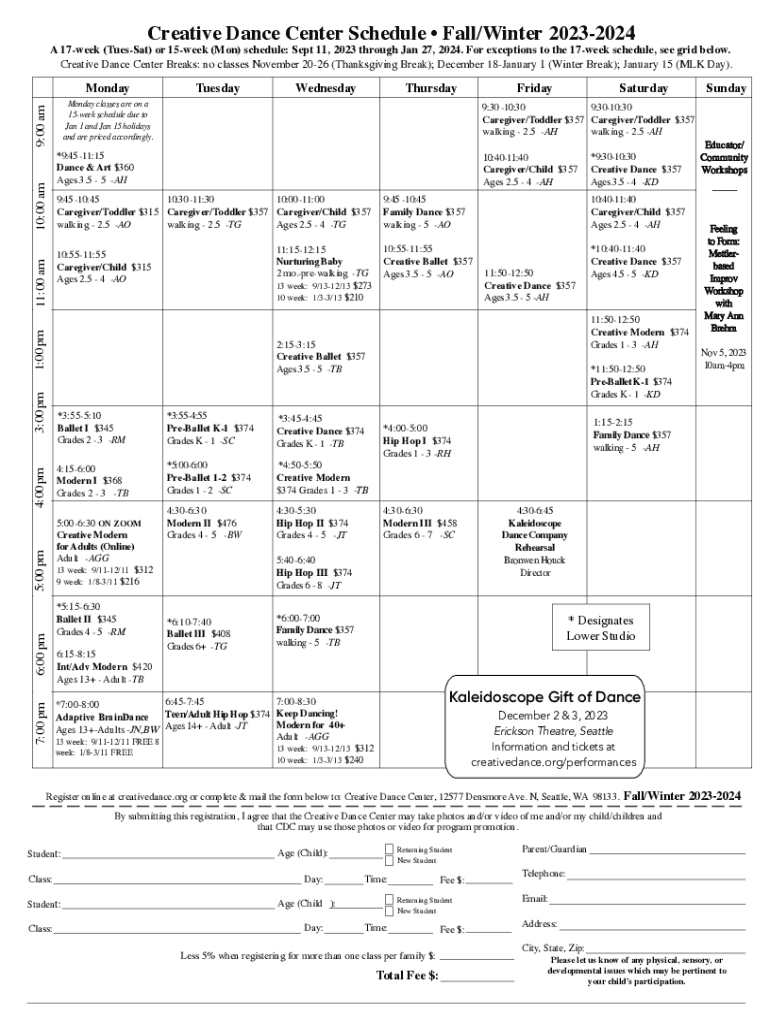 Creative Dance Center Schedule Fall/Winter 20232024A 17week (TuesSat) or 15week (Mon) schedule: Sept 11, 2023 through Jan 27, 2024. For exceptions to the 17week schedule, see grid below. Creative