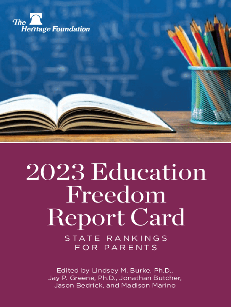 2023 Education Freedom Report Card S TAT E R A N K I N G S F O R PA R E N T S Edited by Lindsey M. Burke, Ph.D., Jay P. Greene, Ph.D., Jonathan Butcher, Jason Bedrick, and Madison Marino2023 STATE
