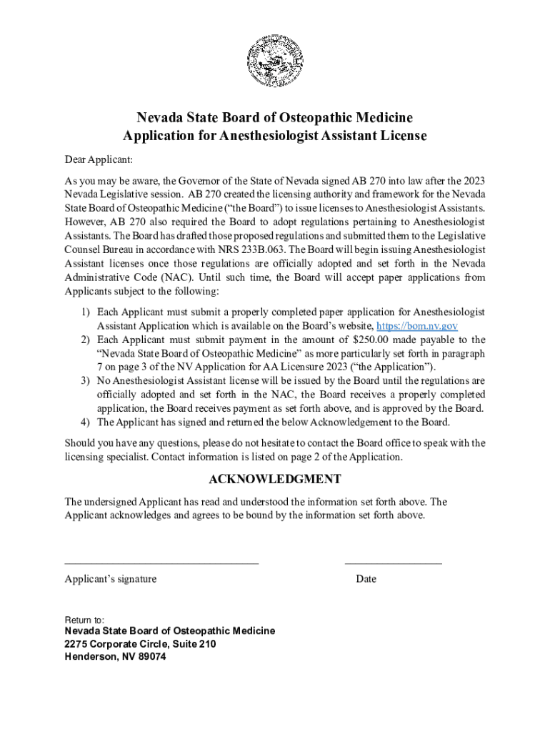 Nevada State Board of Osteopathic Medicine Application for Anesthesiologist Assistant License Dear Applicant: As you may be aware, the Governor of the State of Nevada signed AB 270 into law after