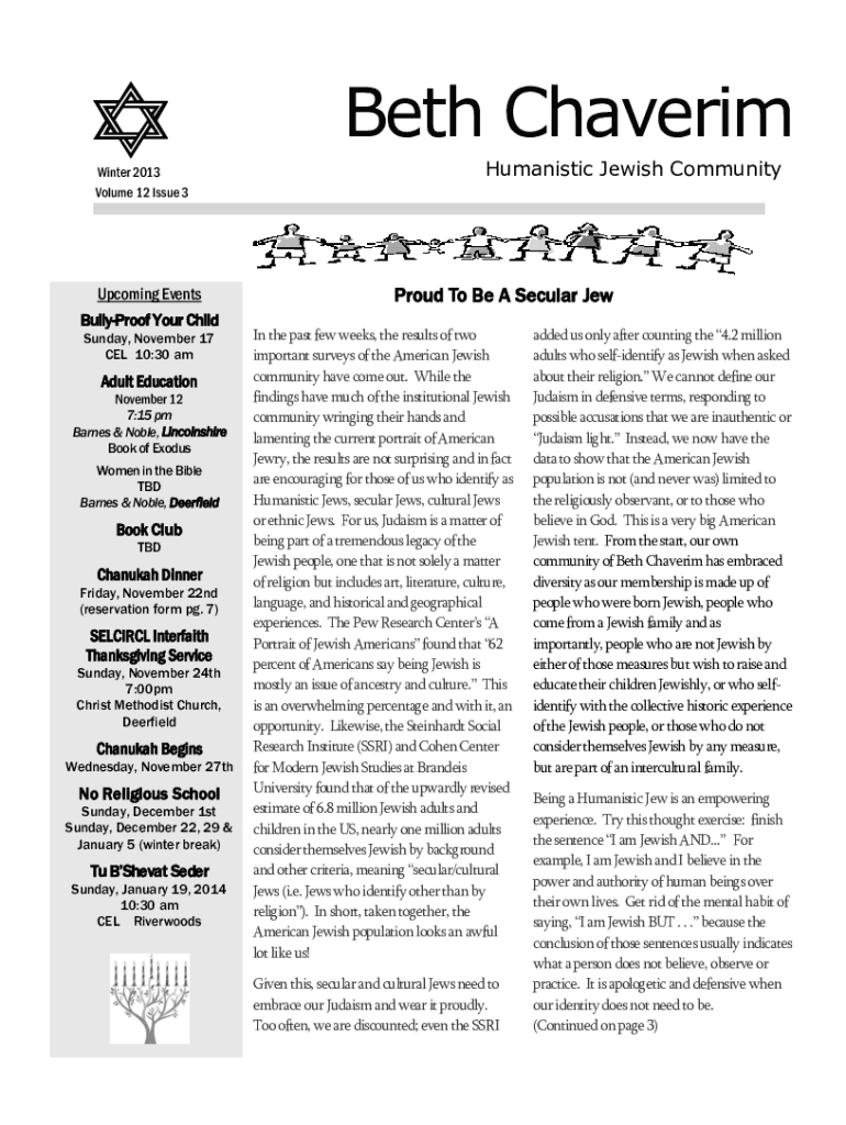 Beth Chaverim Winter 2013 Volume 12 Issue 3Upcoming Events BullyProof Your Child Sunday, November 17 CEL 10:30 amAdult Education November 12 7:15 pm Barnes & Noble, Lincolnshire Book of Exodus Women