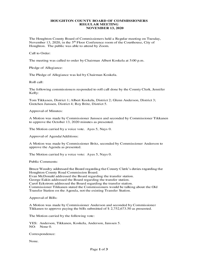 HOUGHTON COUNTY BOARD OF COMMISSIONERS REGULAR MEETING NOVEMBER 13, 2020The Houghton County Board of Commissioners held a Regular meeting on Tuesday, November 13, 2020, in the 5th Floor Conference