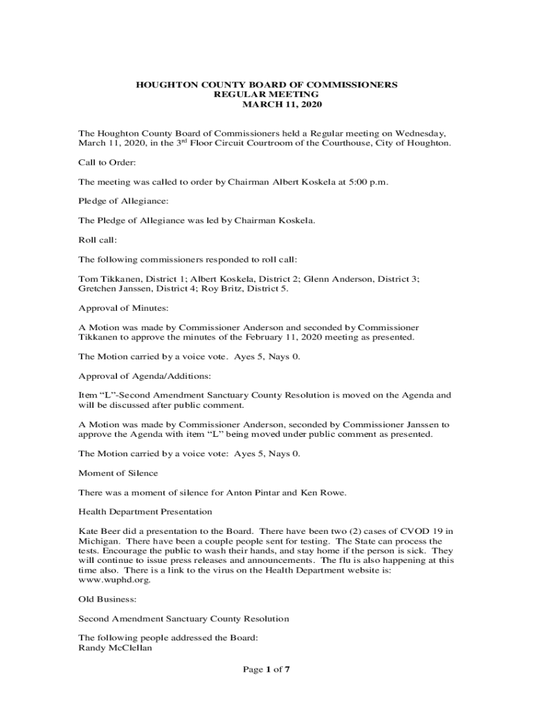 HOUGHTON COUNTY BOARD OF COMMISSIONERS REGULAR MEETING MARCH 11, 2020The Houghton County Board of Commissioners held a Regular meeting on Wednesday, March 11, 2020, in the 3rd Floor Circuit Courtroom