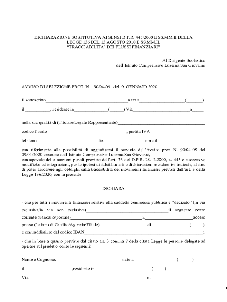 DICHIARAZIONE SOSTITUTIVA AI SENSI D.P.R. 445/2000 E SS.MM.II DELLA LEGGE 136 DEL 13 AGOSTO 2010 E SS.MM.II. TRACCIABILITA DEI FLUSSI FINANZIARI Al Dirigente Scolastico dellIstituto Comprensivo Luserna