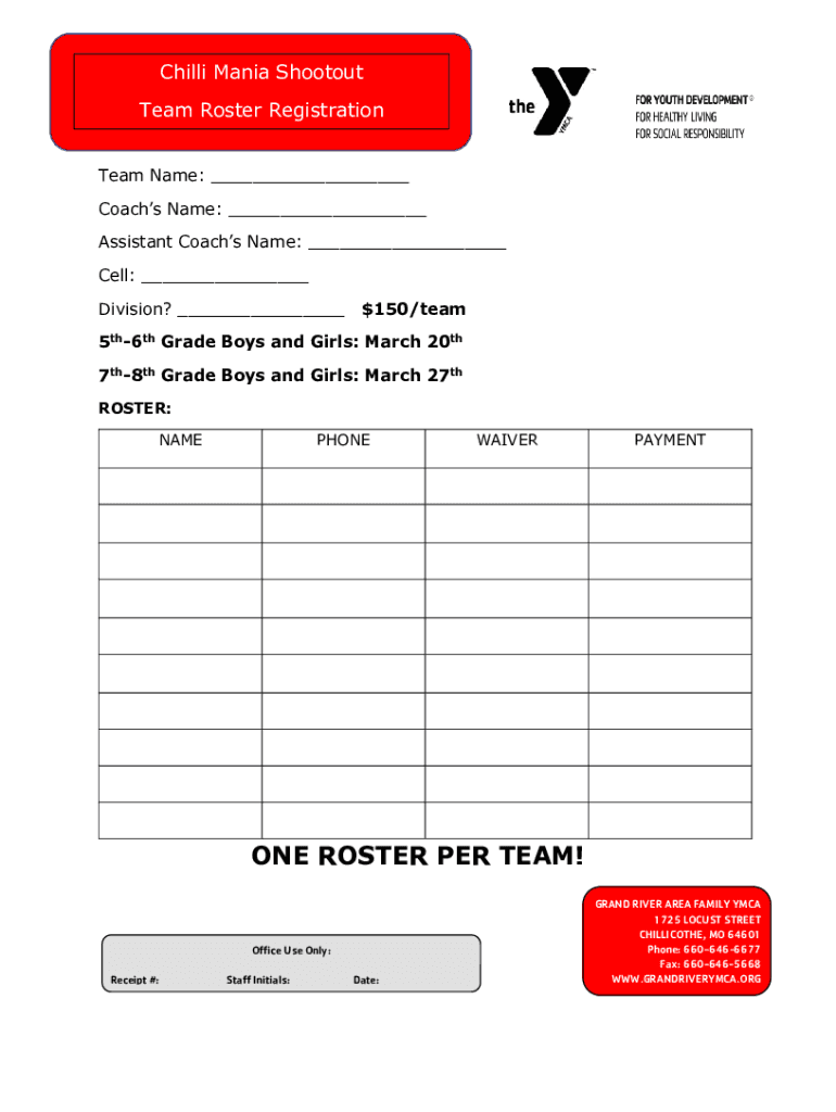 Chilli Mania Shootout Team Roster Registration Team Name: ___ Coachs Name: ___ Assistant Coachs Name: ___ Cell: ___ Division? ___$150/team5th6th Grade Boys and Girls: March 20th 7th8th Grade Boys