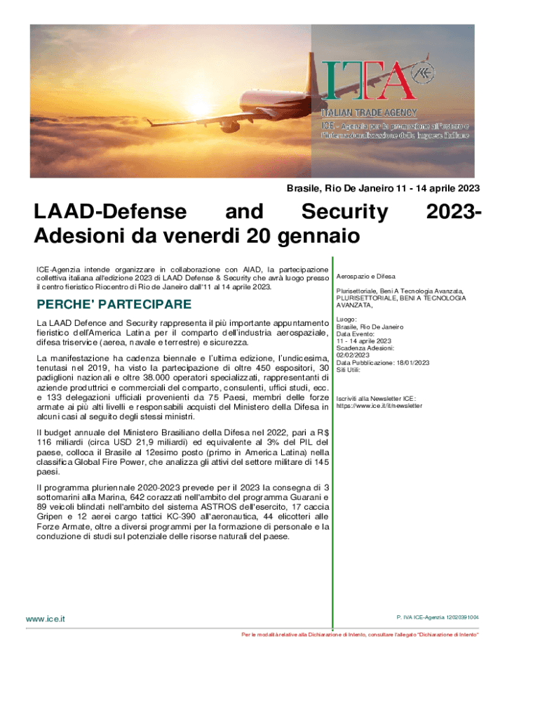 Brasile, Rio De Janeiro 11 14 aprile 2023LAADDefense and Security Adesioni da venerdi 20 gennaio2023ICEAgenzia intende organizzare in collaborazione con AIAD, la partecipazione collettiva italiana