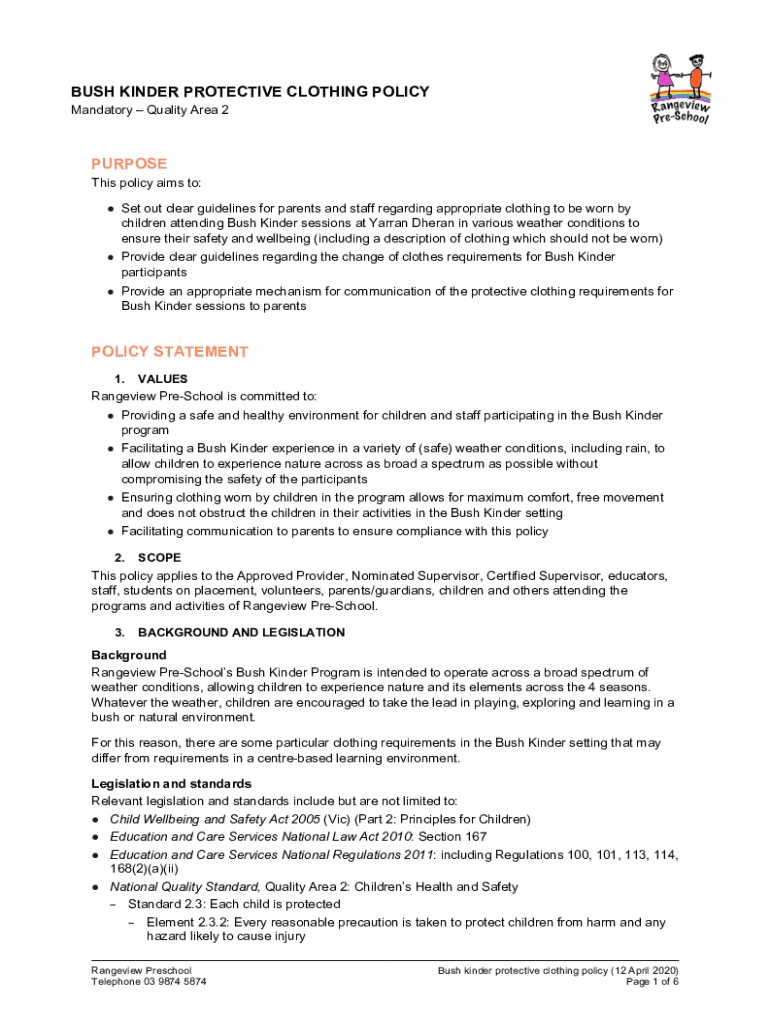 Get the free BUSH KINDER - Protective Clothing Policy - Shine Bright EYM - rangeviewpreschool vic...