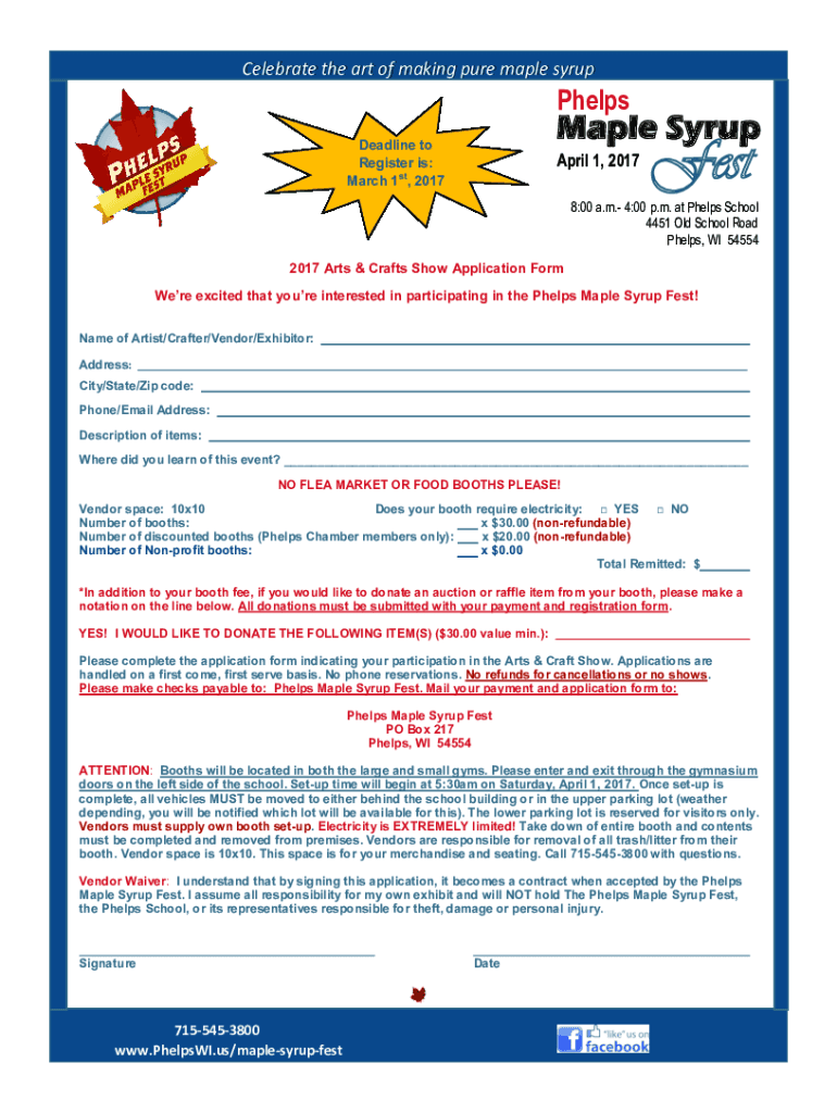 Celebrate the art of making pure maple syrupPhelpsMaple SyrupDeadline to Register is: March 1st, 2017April 1, 2017Fest8:00 a.m. 4:00 p.m. at Phelps School 4451 Old School Road Phelps, WI 54554 2017