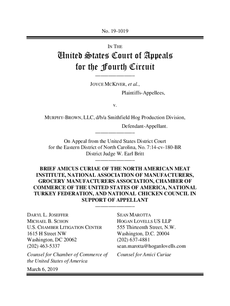 No. 191019 IN THEUnited States Court of Appeals for the Fourth Circuit ___JOYCE MCKIVER, et al., PlaintiffsAppellees, v. MURPHYBROWN, LLC, d/b/a Smithfield Hog Production Division, DefendantAppellant.