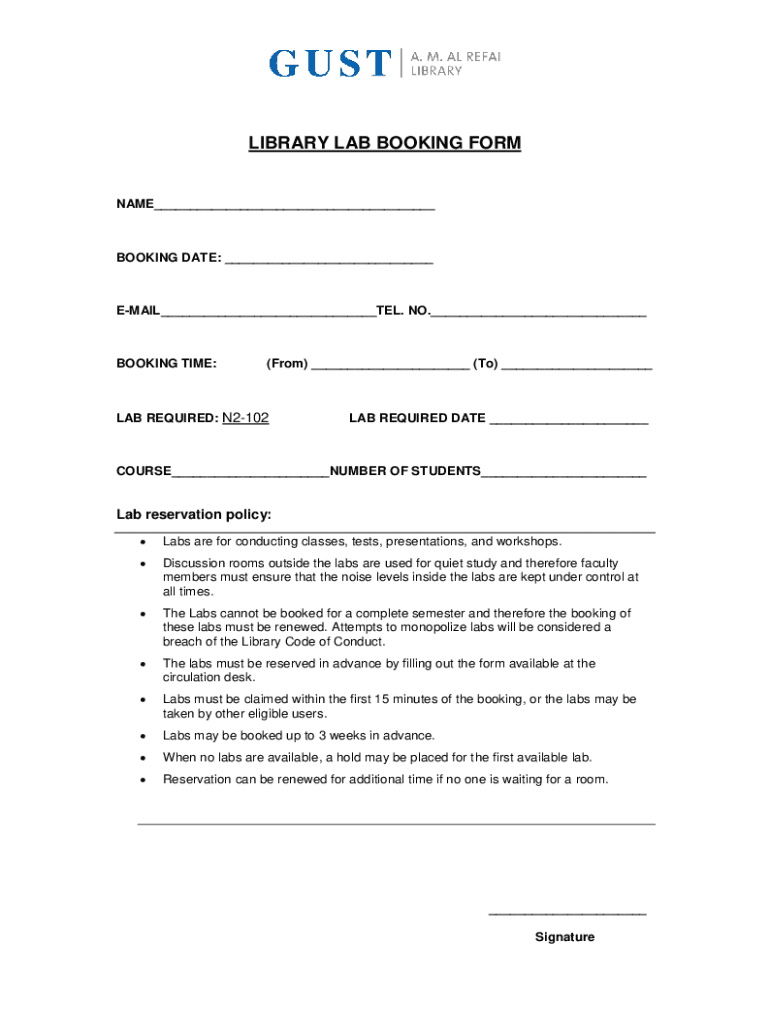 LIBRARY LAB BOOKING FORMNAME___BOOKING DATE: ___EMAIL___TEL. NO.___BOOKING TIME:(From) ___ (To) ___LAB REQUIRED: N2102LAB REQUIRED DATE ___COURSE___NUMBER OF STUDENTS___Lab reservation policy: Labs